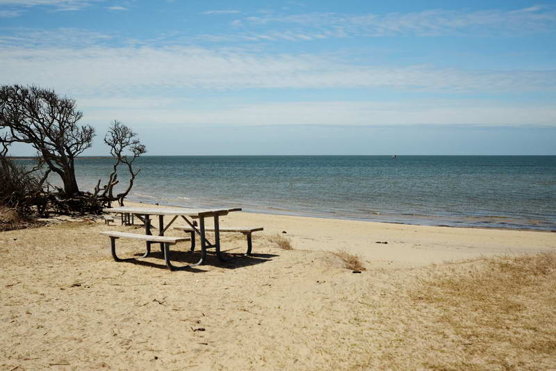 About 29 miles down the Park Road and just outside the town of Salvo watch for a sign for the Salvo Day Use Area off to your right side. While not very glamorous, all the way at the north end you’ll find restrooms and not too far away, some weather-beaten picnic tables at a beach. We found this a great place to stop, stretch our legs and explore the sand along Clarks Bay. After you’ve got your energy back up, it’s time for the day trip to continue as you explore the sand dunes.