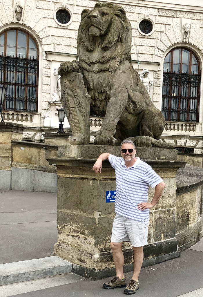 We made our way back to St. Stephan’s church and then began to explore streets we hadn’t seen the day before. Where we’d gone left on Friday, we turned right on Saturday. At one point we found ourselves in the gardens behind the Hofburg Palace; this is a beautiful and peaceful place to just walk or sit and relax. A short while later we stumbled upon another statue of a lion to get my picture taken with… bonus! We took our time exploring and looking at the public art and architecture of the city. Before we knew it, it was lunchtime!